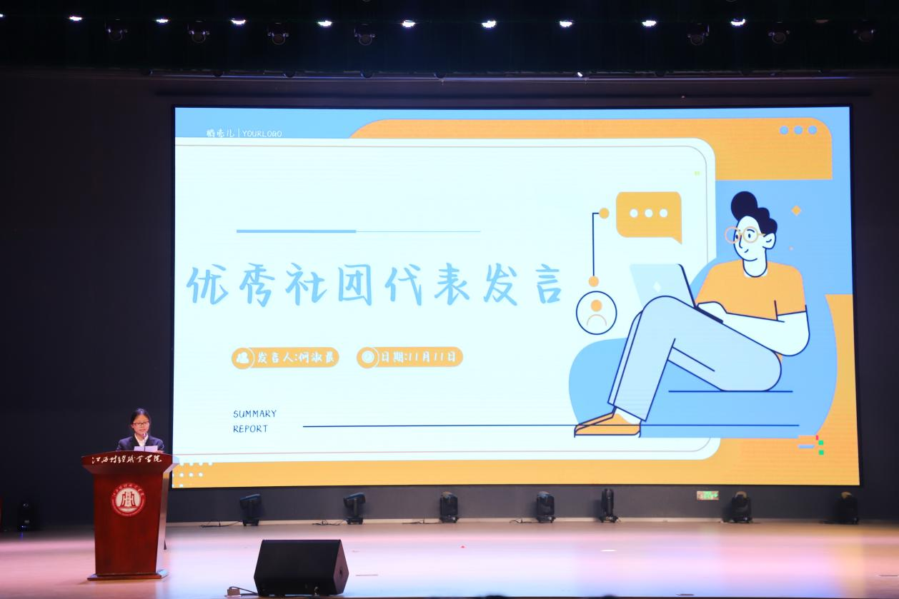 优秀社团代表何淑晨上台发言。她分享了自己在数字经济学院青年志愿者协会中的成长经历和感悟,号召大家积极参与社团活动,用自己的热情和才华去感染身边的人,共同营造积极向上的校园文化氛围。
