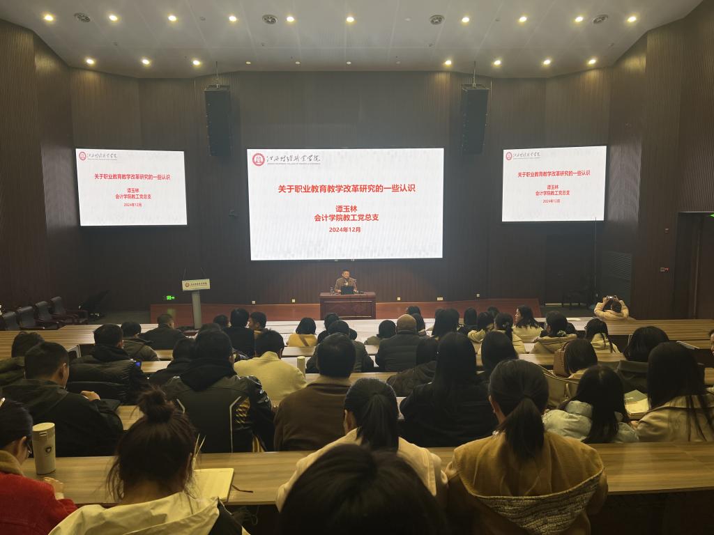 12月4日,beat365官网在八里湖校区行政楼二号报告厅举办了“师说讲堂”系列活动,会计学院副院长谭玉林作“职业教育教学改革研究的一些认识”专题报告,副校长冯弋江出席活动,会计学院、数字经济学院全体专兼职教师100余人参会,报告会由教务处副处长龚少卿主持。