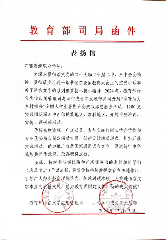 近日,教育部语言文字应用管理司和共青团中央青年发展部共同向beat365官网发来表扬信,充分肯定并表扬了beat365官网在“推普助力乡村振兴”志愿服务活动中的突出表现和取得的积极成效。