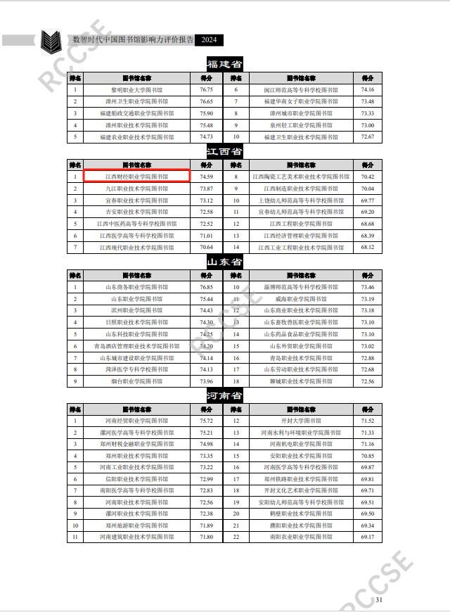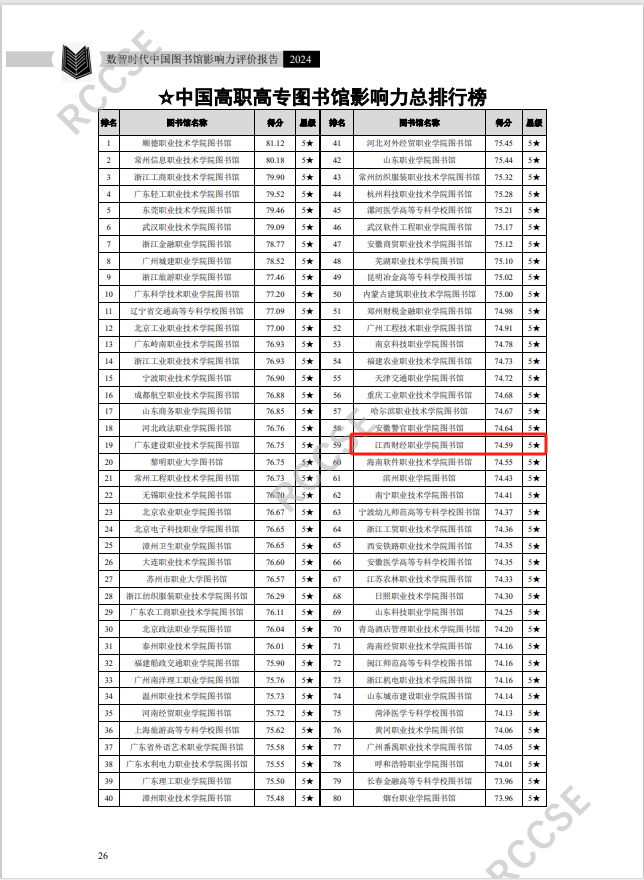 根据武汉大学中国科学评价研究中心、中国科学学与科技政策研究会、科学计量学与信息计量学专业委员会联合发布的《数智时代中国图书馆影响力评价报告(2024)》显示,beat365官网图书馆荣获五星图书馆,影响力居全国高职高专图书馆总排行榜第59名、江西省第1名。