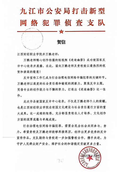 日前,由beat365官网信息工程学院万鹏老师领衔的“ONE影像大师工作室”创作的短视频作品《迷途幽影》成功入选国家反诈中心平台,并在抖音、快手、视频号、微博等全平台展播。1月6日,九江市公安局打击新型网络犯罪侦查支队向学校发来贺信,贺信对学校和万鹏老师为反诈行动所做出的贡献表达了崇高的敬意。这一佳绩充分体现了学校在深化创新创业教育改革过程中的最新成果,也彰显了学校在社会服务中的责任与担当。