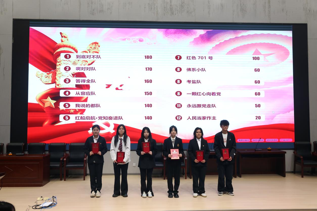 比赛历时一个多月,经学院推荐、校级初赛,共12支队伍脱颖而出、闯进决赛。决赛围绕党的二十大精神、党的二十届三中全会精神、习近平总书记关于党的建设的重要思想、中国共产党简史等内容,设置了团队必答题、风险挑战题和加赛题三个环节。