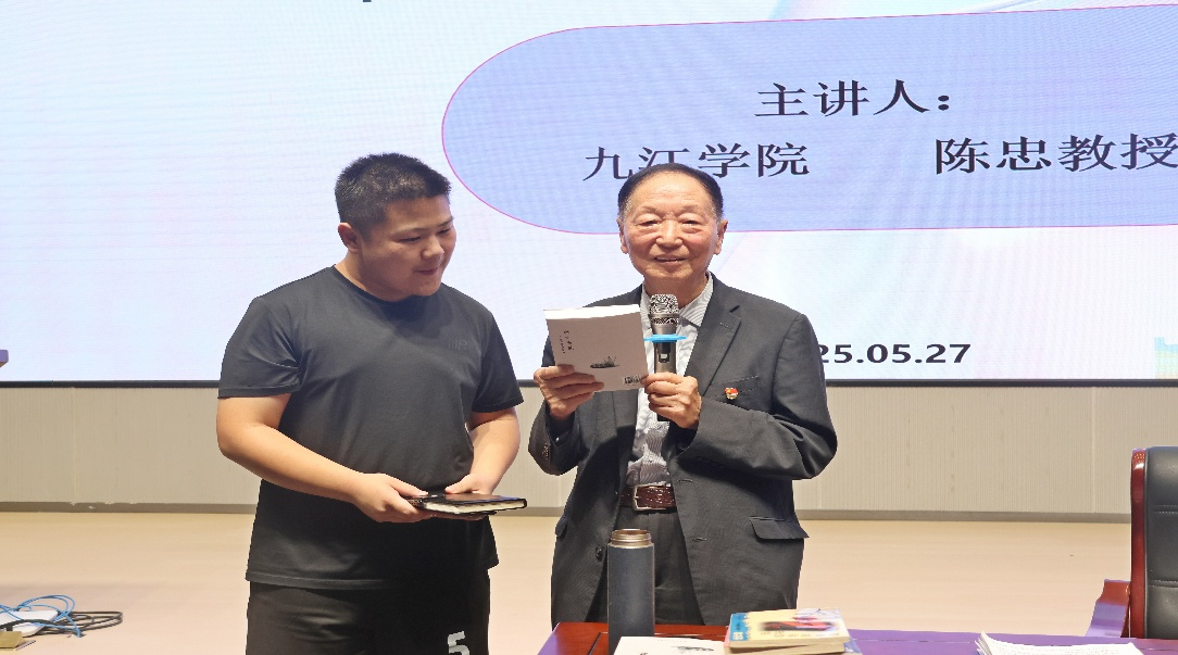 整场讲座过程中,陈忠教授积极与同学们互动,陈忠教授强调,一定要时刻保持好奇心,边学习、边观察,善于发现生活中的新鲜感,激励自己永远前进,并将自己编著的书籍赠予积极参与互动的同学。