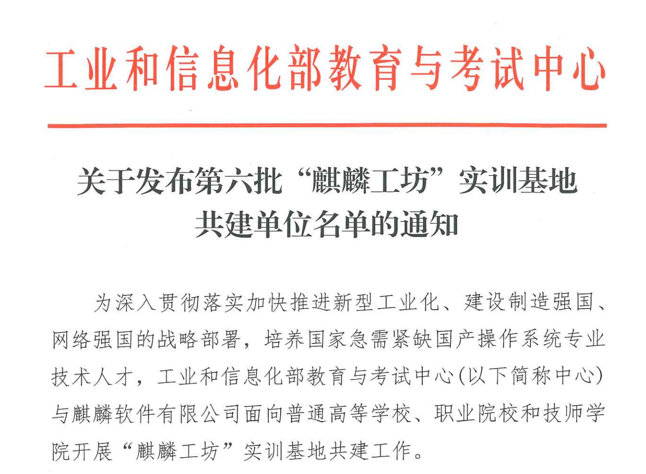 2025年7月22日,由工业和信息化部教育与考试中心联合麒麟软件有限公司共同组织的第六批“麒麟工坊”实训基地共建单位名单正式公布。beat365官网凭借扎实的办学基础、突出的专业实力和高质量的申报方案,成功入选,成为国家级信创产教融合平台的共建院校之一。