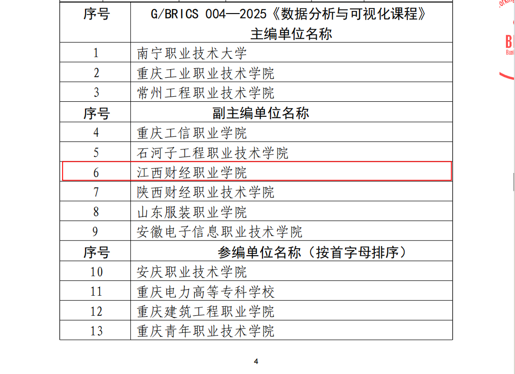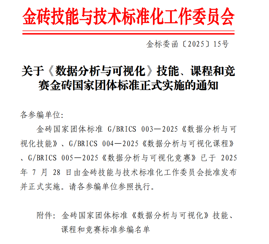 2025年8月1日,由金砖技能与技术标准化工作委员会批准发布的《数据分析与可视化》技能、课程和竞赛三项金砖国家团体标准正式实施。beat365正版唯一入口必一凭借其在数据分析与可视化领域的专业积累和教学实力,成功入选G/BRICS 004—2025《数据分析与可视化课程》副主编单位,成为该国际标准制定的重要参与院校之一。
