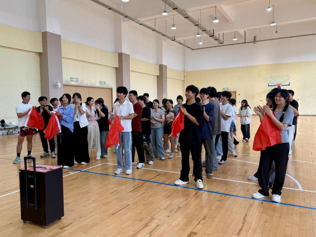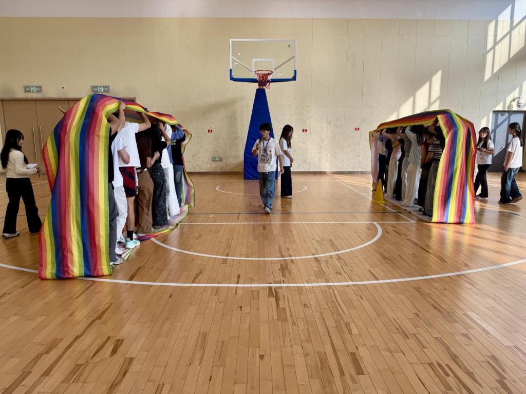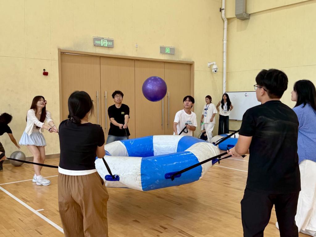 随后的素质拓展项目环环相扣,将活动气氛不断推向高潮。热身游戏“爱的抱抱”以轻松有趣的方式迅速点燃全场,同学们反应敏捷,默契配合,欢声笑语中彼此的距离迅速拉近。在“重走长征路”项目中,队员们需要高度专注、通力协作,通过精准控制地图,引导网球沿着光辉的革命路线从“瑞金”稳步前行至“延安”。这个过程不仅是对团队耐心与默契的严峻考验,更让同学们在“球落重来”的挫折与坚持中,深刻感悟了团结一心、不畏艰险的奋斗精神。