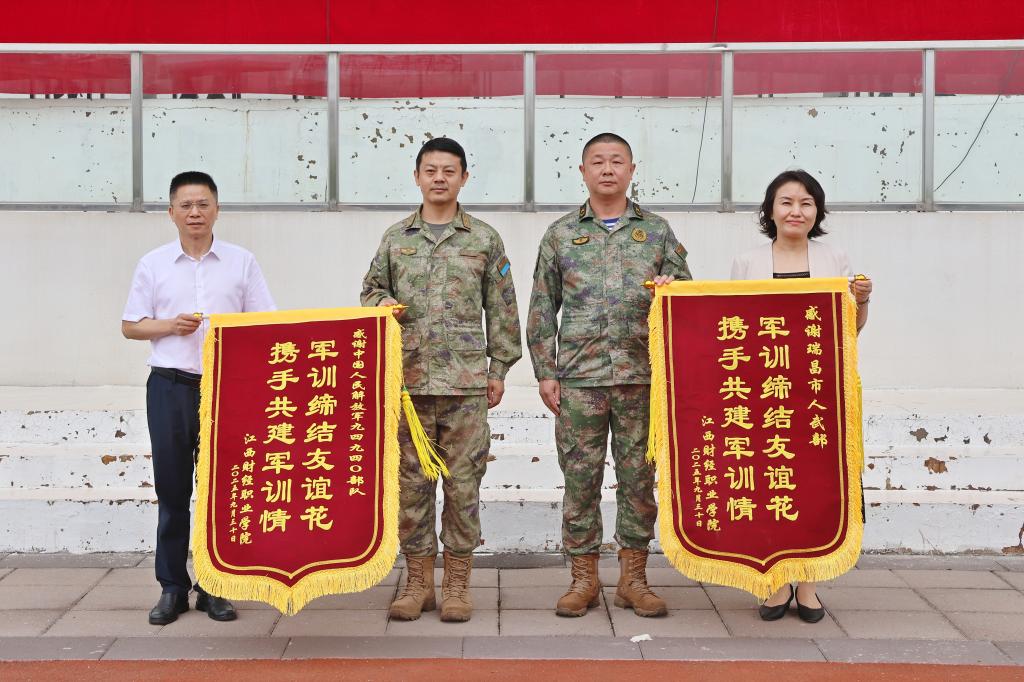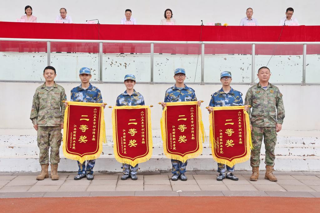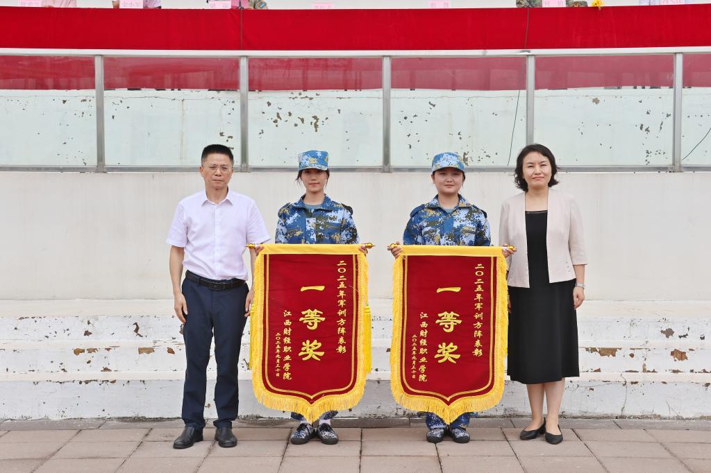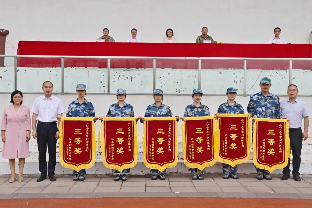 梁瑞、何焰分别宣读了八里湖校区和浔阳校区军训获奖班级名单,代表承训单位向圆满完成军训任务的2025级全体新生表示祝贺,并与学校领导一起为军训获奖队伍颁发了锦旗。