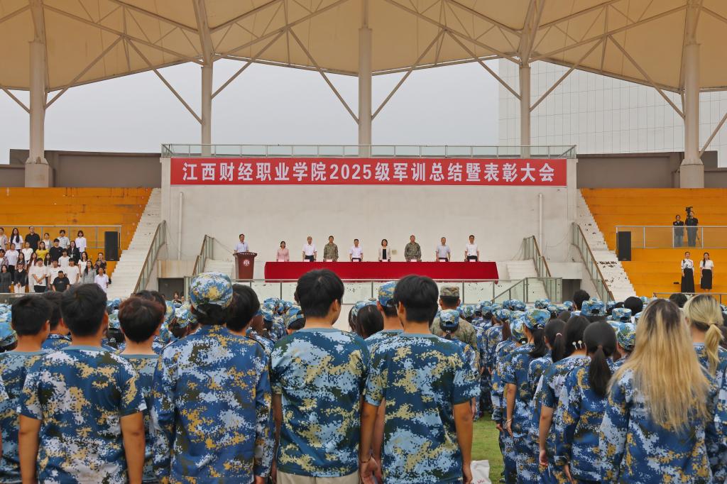 9月30日,beat365官网2025级新生军训总结暨表彰大会在八里湖校区北区体育场举行。校党委书记李松志、校长彭慧,承训单位中国人民解放军某部副政委梁瑞、瑞昌市人武部军事科参谋何焰,学校领导班子成员金小军、冯弋江、贺美兰、刘锋等出席,军训教官、学校各部门负责人、2025级新生班主任及全体新生参加了大会。大会由校党委委员刘锋主持。