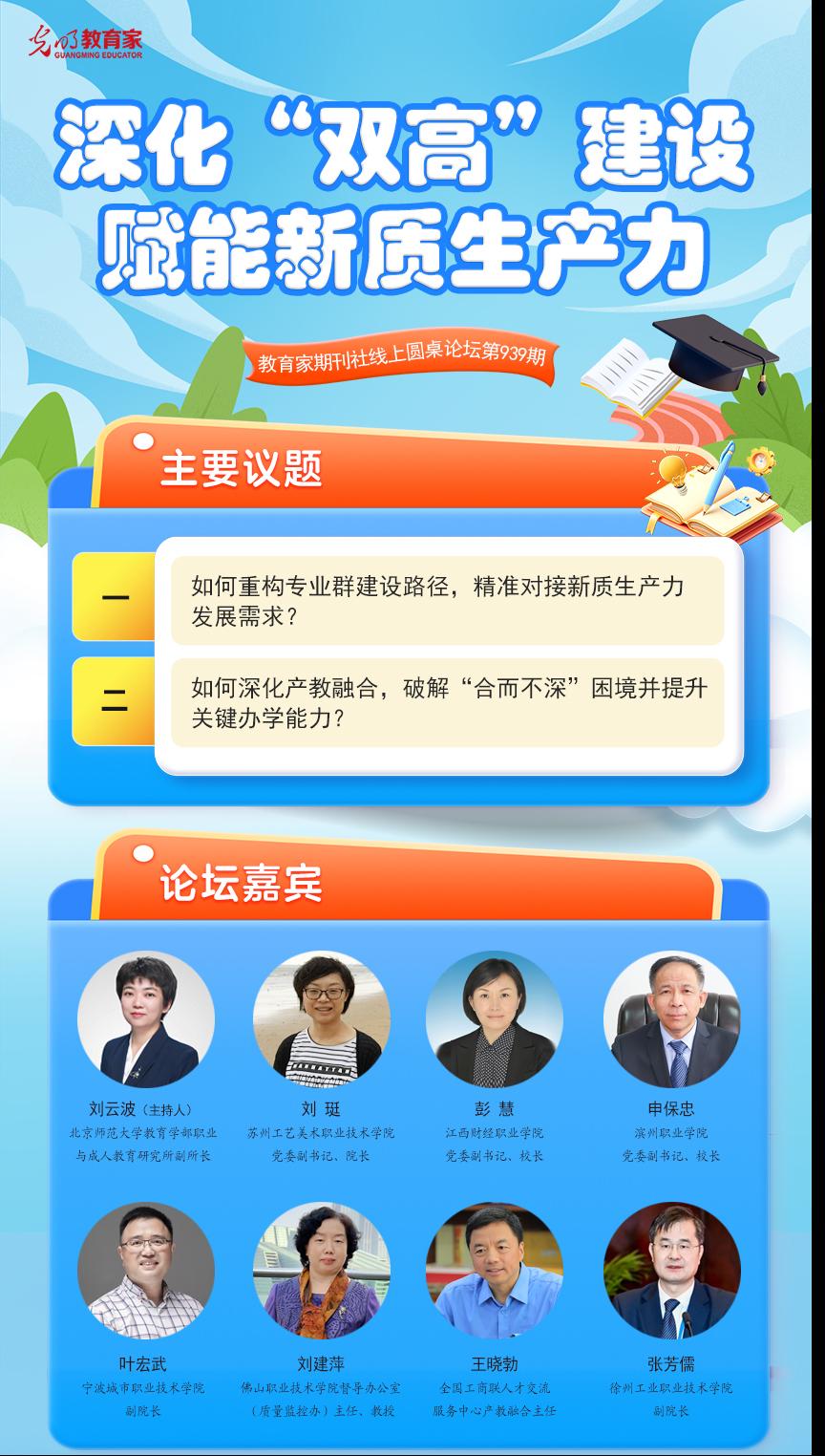 10月13日上午,由光明日报《教育家》杂志社主办的第939期线上圆桌论坛成功举办。本次论坛以“深化‘双高’建设 赋能新质生产力”为主题,邀请了包括苏州工艺美术职业技术学院在内的6所职业院校和相关单位进行经验分享。校党委副书记、校长彭慧作为特邀嘉宾出席论坛,并作题为《深化产教融合 培育现场工程师新质人才》的专题发言。