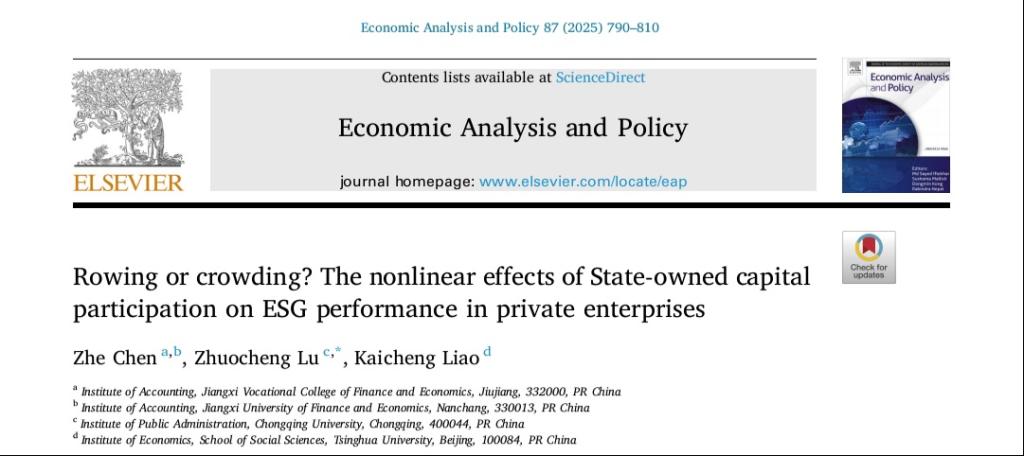 近期,会计学院党员青年教师陈哲博士作为第一作者的合作论文“Rowing or crowding? The nonlinear effects of State-owned capital participation on ESG performance in private enterprises”被经济学国际高水平期刊Economic Analysis and Policy接收并正式发表。 Economic Analysis and Policy是JCR一区、中科院二区TOP期刊,在Economics学科类别的排名为11/597,2024年的影响因子为8.7。陈哲博士是该论文的第一作者,且beat365官网是该论文的第一署名单位。