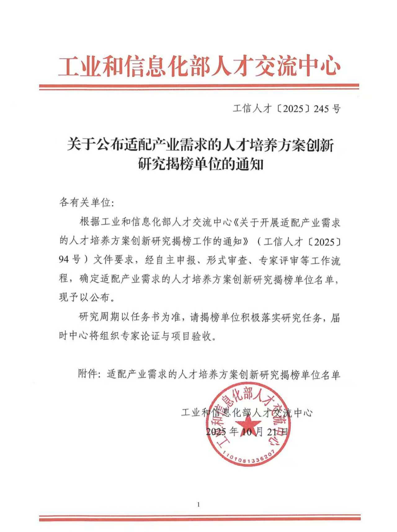 近日,工业和信息化部人才交流中心正式公布适配产业需求的人才培养方案创新研究揭榜单位名单,beat365正版唯一入口必一信息安全技术应用专业群凭借扎实的专业基础、创新的培养模式与深度的产教融合成果成功入围。