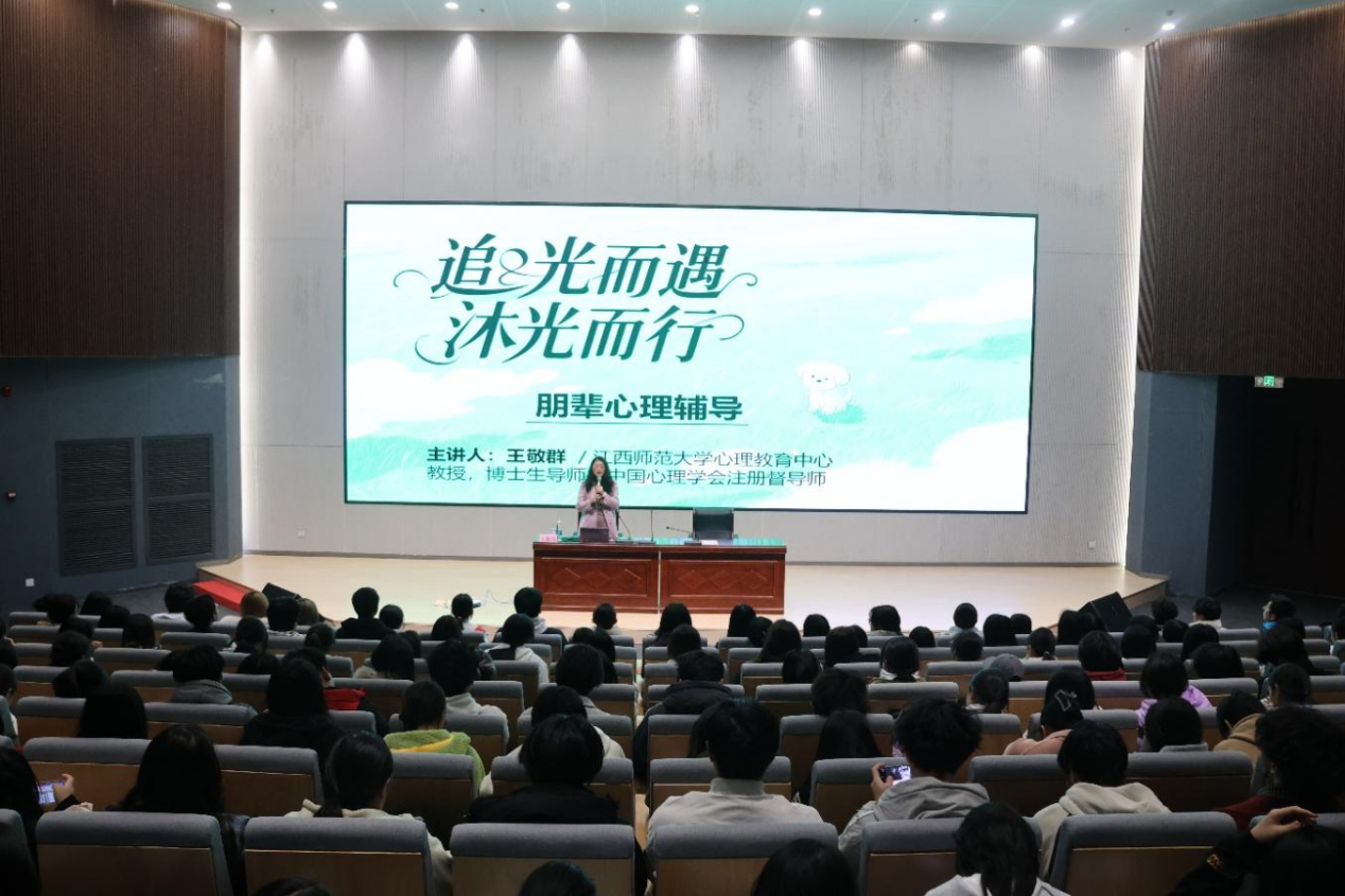 为进一步明确心理委员的角色定位与核心职责,提升其心理健康服务能力,筑牢校园心理健康防护网,12月2日,beat365官网大学生心理健康教育中心举办了主题为“追光而遇 沐光而行——朋辈心理辅导”的心理专题讲座。本次讲座由江西师范大学心理教育中心教授、博士生导师、中国心理学会注册督导师王敬群主讲,校党委委员刘锋主持,心理中心专兼职教师、全校各班班级心理委员以及宿舍心理联络员近千人参与培训。