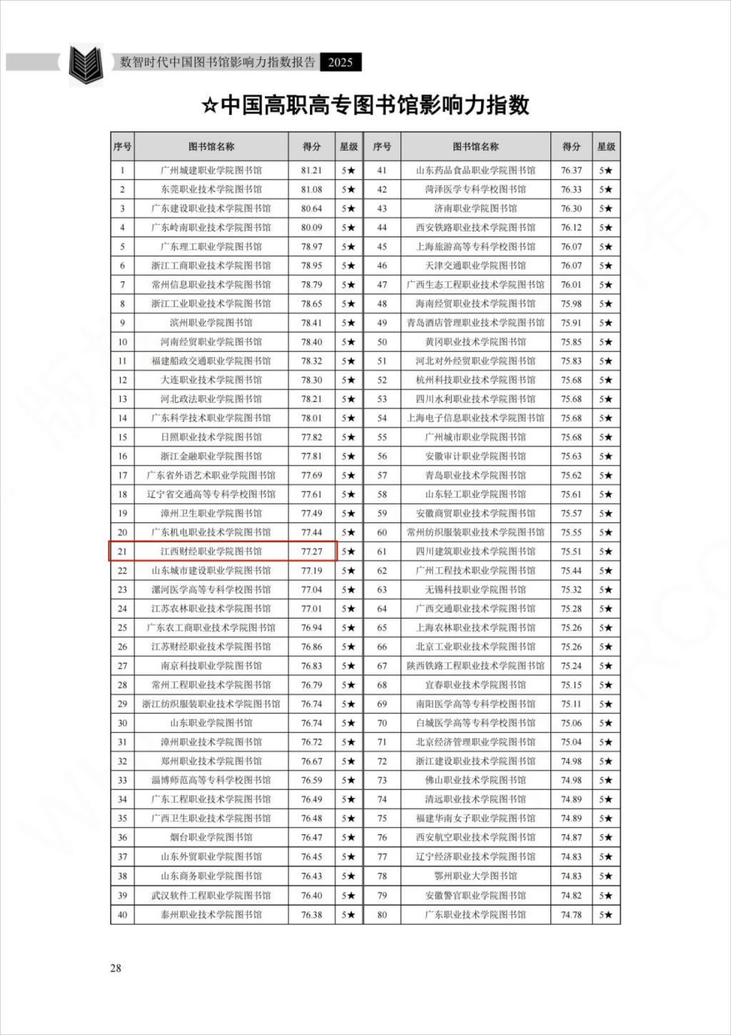 近日,由武汉大学中国科学评价研究中心、数字出版智能服务技术教育部工程研究中心研发的《数智时代中国图书馆影响力指数报告(2025版)》正式发布。beat365官网图书馆获五星图书馆评价,蝉联中国高职高专图书馆影响力排行榜江西省第1位,全国排名由2024年的第59位跃升至第21位,首次进入“职专院校图书馆影响力三十强”。