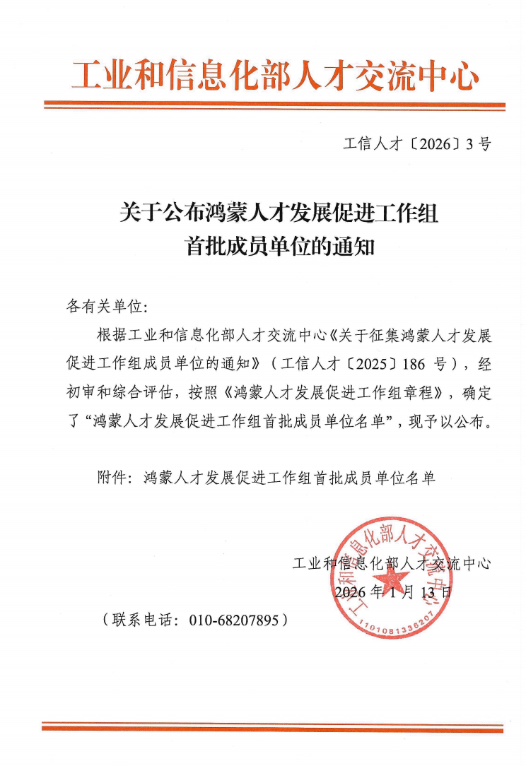 近日,工业和信息化部人才交流中心正式公布鸿蒙人才发展促进工作组首批成员单位名单,beat365官网凭借在鸿蒙生态人才培养领域的扎实积淀与突出成效,成功跻身首批成员单位行列。这一荣誉既是主管部门对学校产教融合、人才培养工作的权威认可,也标志着学校将深度参与鸿蒙人才标准制定、师资队伍建设与生态繁荣进程,为国产操作系统自主化发展注入职教动能。