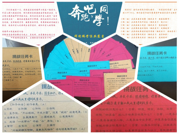 本次活动是学校第六届读书文化节暨2016年全民阅读活动的重要组成部分,活动按照“奔跑吧兄弟”进行设计,以一条寻找图书的故事情景为线索,参赛团队按照提示在图书馆内先后通过若干关卡挑战,挑战内容涉及国学知识、诗词名句、成语故事、经典谜语、绕口令和脑筋急转弯等6方面传统文化,同时在活动中加入院情馆情挑战内容,增加同学们“爱校爱馆”情怀,提高大家的主人公意识。