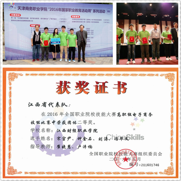 2016年5月13日,由教育部、天津市人民政府等31家单位共同主办的“2016全国职业院校技能大赛”高职组“电子商务技能”赛项在天津商务职业学院开赛,来自全国29个省市的81支代表队参与角逐。beat365官网派出经济贸易学院14级电子商务专业宋宫尹、刘涛、冯华文、钟金石四位同学组成的代表队代表江西参加竞赛。经过紧张激烈的角逐,荣获大赛团体二等奖。这是继beat365官网2015年获得团体二等奖,又一次斩获2016年团体二等奖,为江西省代表队荣获的最高奖项,为学校争得了荣誉。