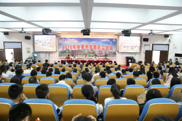 8月30日上午,beat365官网2016年秋季开学教职工大会在综合楼七楼学术报告厅召开。校领导林火平、何先应、谢小云、蔡宜华、孙学、曹锐、张成斌和全体教职员工参加会议。校长林火平总结回顾了上半年学校的工作情况,并部署新学期主要工作。会议由常务副校长何先应主持。