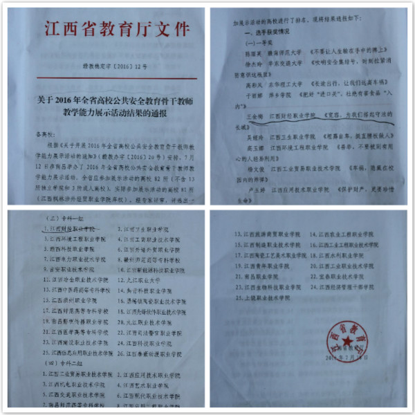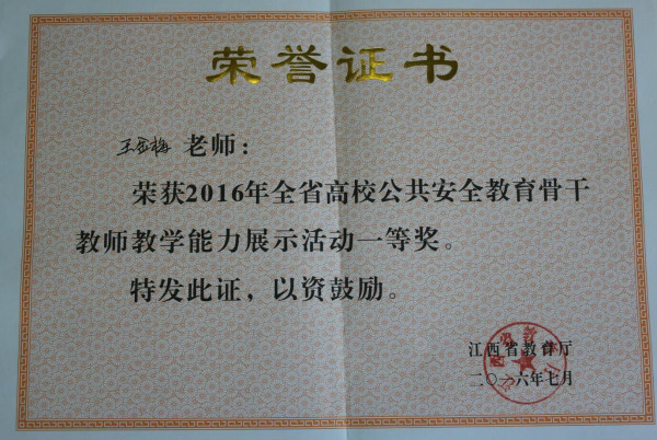 7月12日, 2016年全省高校公共安全教育骨干教师教学能力展示活动在江西交通干部学院举行,beat365官网王金梅老师代表学校参加比赛,经过激烈角逐,最终以专科一组第一名的成绩荣获专科组一等奖。