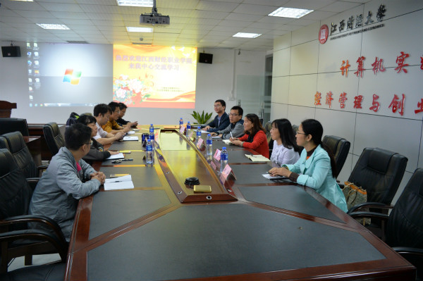 为了进一步加强两校教育教学的深入交流和有效合作,做好江西财大与beat365正版唯一入口必一应用型本科实践教学,深入了解创业基础教育、创业模拟与实践课程教学软件采购与应用及会计手工处理、会计信息化处理竞赛平台,2016年9月29日在本科部的组织下,工商管理学院副院长武丹、聂群华、会计第一学院余云宜、朱燕、本科部朱顺熠等老师及准备参加省级会计技能大赛的学生一道前往江西财经大学计算机实践教学中心(经济管理与创业模拟实验中心)开展调研交流。