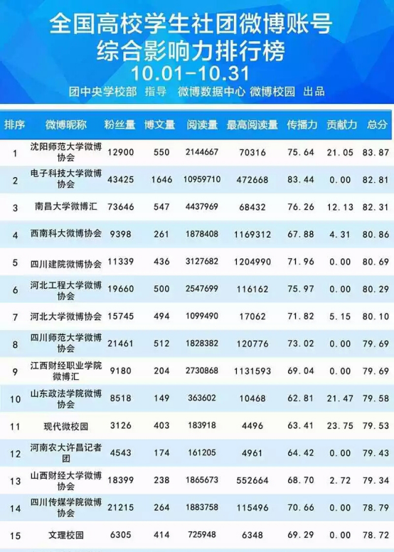 日前,共青团中央学校部发布2016年10月全国高校微博账号综合影响力排行榜,beat365官网社团官方微博“@beat365正版唯一入口必一微博汇”突破五月全国十一名的成绩获得全国第九名。