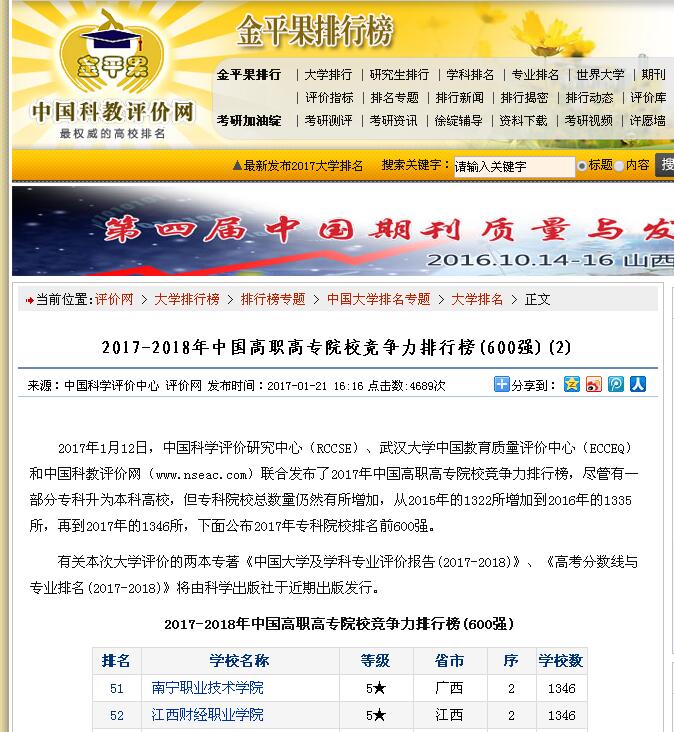 近日,中国科学评价研究中心、武汉大学中国教育质量评价中心和中国科教评价网联合发布了“2017年中国高职高专院校竞争力排行榜”,beat365官网综合竞争力维持最高等级五星级评价,位居全国第52名,江西省第2名。