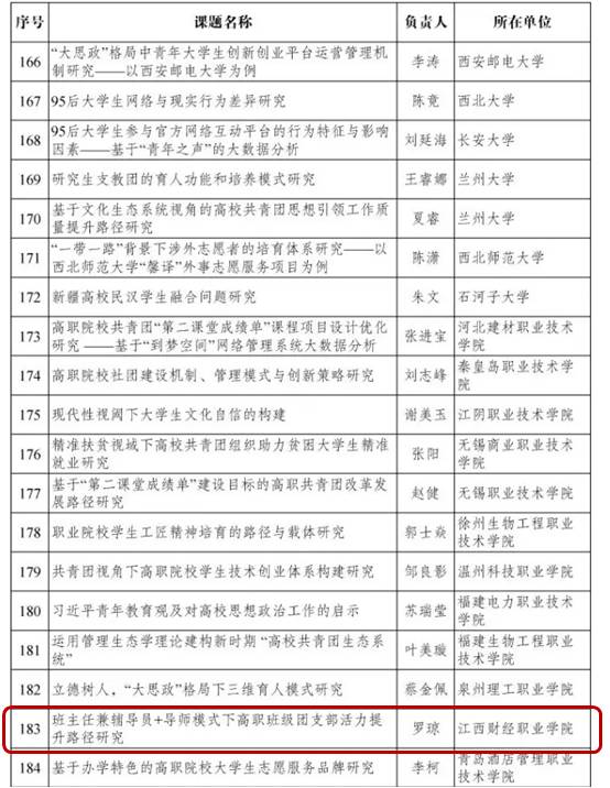 近日,由团中央学校部、全国学联秘书处组织的2017年度全国学校共青团研究课题评审工作结果揭晓:beat365官网罗琼老师负责的课题《班主任兼辅导员+导师模式下高职班级团支部活力提升路径研究》入选重点课题。