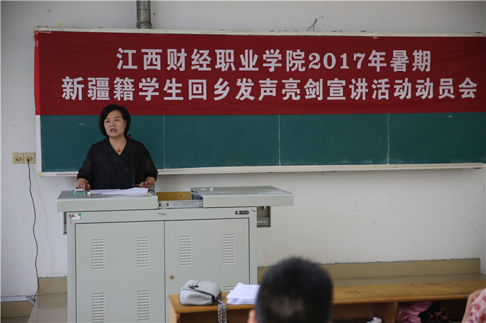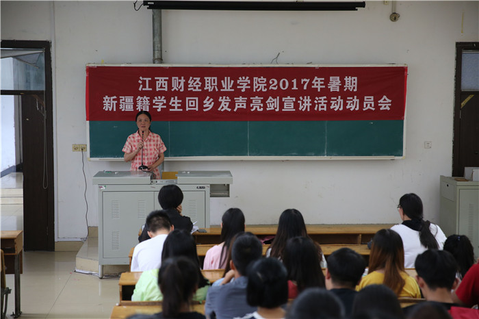 会议由学工处处长主持,刘香敏老师就本次活动的内容和方法做了具体部署和安排后,学工处处长从讲政治、讲纪律、讲奉献三个方面对新疆籍全体学生提出了要求。她要求全体新疆籍同学要高度重视本次暑期回乡发声亮剑宣讲活动,切实发挥每位同学在维护社会稳定和长治久安、加强民族团结、增进民族互信方面的积极影响,要求同学们在活动中长知识,增才干,做贡献。本次发声亮剑活动覆盖到每名新疆籍学生所在的乡、镇、村,活动以宣传民族团结、民族互信和去极端化为基调,声讨“三股势力”的反动本质,揭露其丑悪嘴脸,表明学生自己坚定的政治立场。