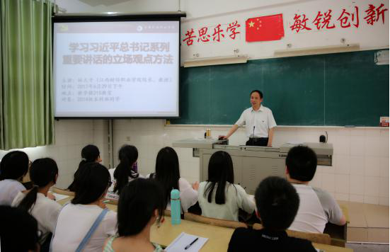 6月29日下午4:30,校党委副书记、校长林火平教授在教学楼215教室为学生讲授思想政治理论课。来自2014级本科班的70多名同学坐满整个教室,认真聆听了林火平校长1小时的讲课。