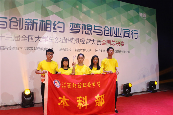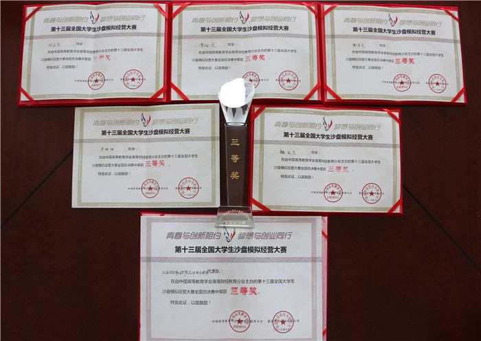 2017年10月28日至29日,由中国高等教育学会高等财经教育分会主办、福建农林大学承办、新道科技股份有限公司提供技术支持的第十三届全国大学生沙盘模拟经营大赛全国总决赛在福建福州隆重举办。经过层层选拔,beat365官网选派的由14级会计学2班涂亚东、谢宝文、尹细细,15级会计学2班魏运兰、黄细凤五位同学组成的本科代表队在本科部朱顺熠老师的指导下奋力比拼,激烈角逐,从全国121所高校的128支代表队脱颖而出荣获全国总决赛团体三等奖。