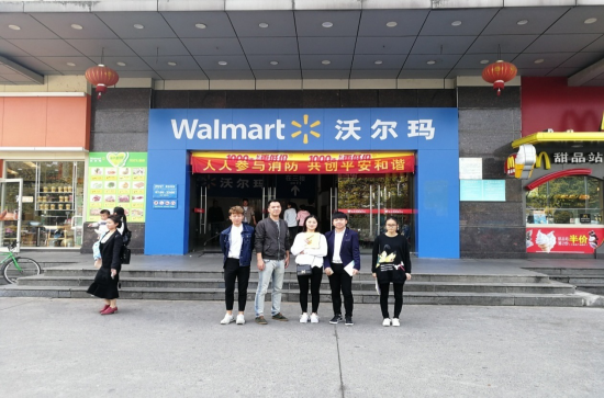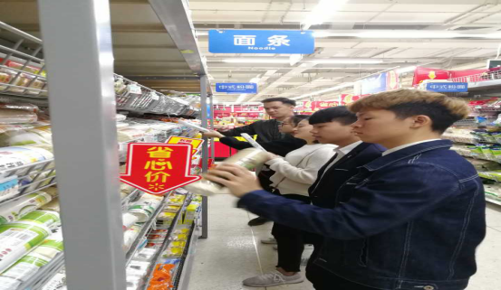 实训指导教师黄博文带领学生到沃尔玛、联盛超市实地调查粮油行业的品牌分布、竞争状况、销售渠道、促销方式等。