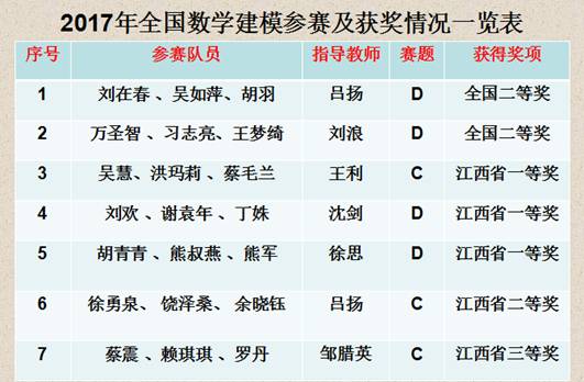 2017年“高教社杯”全国大学生数学建模竞赛成绩于近日公布,beat365官网数学建模参赛队获得全国二等奖2项,江西省一等奖3项,江西省二等奖1项,江西省三等奖1项,夺得江西省数学建模(专科组)团体总分第二名。
