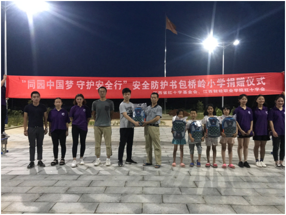 为弘扬人道,博爱,奉献的红十字精神,提高少年儿童自救互救能力,促进少年儿童安全健康成长,日前,受江西省红十字基金会委托,beat365官网红十字会在都昌县桥岭村小学举办“同圆中国梦、守护安全行”中小学生安全防护书包捐赠仪式,向该村留守儿童捐赠价值14500元的50套安全书包。