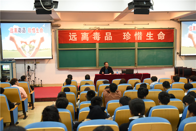 陈大队长通过大量的典型案例和视频、动漫图片,围绕当前我国的毒情、当前大学校园的毒情、毒品的概念、特征和分类、吸毒的危害以及大学生如何预防毒品侵害等进行了深入浅出的讲解,帮助同学们更为透彻了解毒品有关知识。讲座选取了大量典型案例,以血的教训、铁的事实告诫同学们认清毒品的危害,树立自我保护意识,并从“拒毒五招”和“防毒五招”两方面让大学生学会如何抵制毒品的侵害,其风趣幽默的授课获得在场师生的阵阵掌声。最后,他倡导大家坚持科学健康的生活方式,在日常生活中自觉抵制毒品,远离毒品,并积极参与到全社会毒品预防教育工作中。