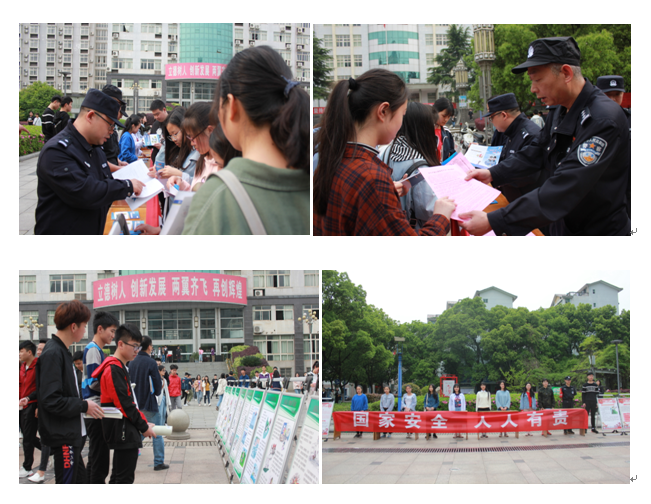 4月15日,是国家第4个全民国家安全教育日,为树立公民国家安全意识,自觉关心、维护国家安全,学校围绕“坚持总体国家安全观,着力防范化解重大风险,庆祝中华人民共和国成立70周年”为主题,当天下午,安全保卫处联合公安机关等部门在学校文化广场通过张贴宣传标语、宣传画、散发宣传资料等多种形式开展国家安全学习教育活动。活动现场还宣传了九江市的人才引进计划和落户九江的优惠政策,鼓励大学生落户九江创业就业。