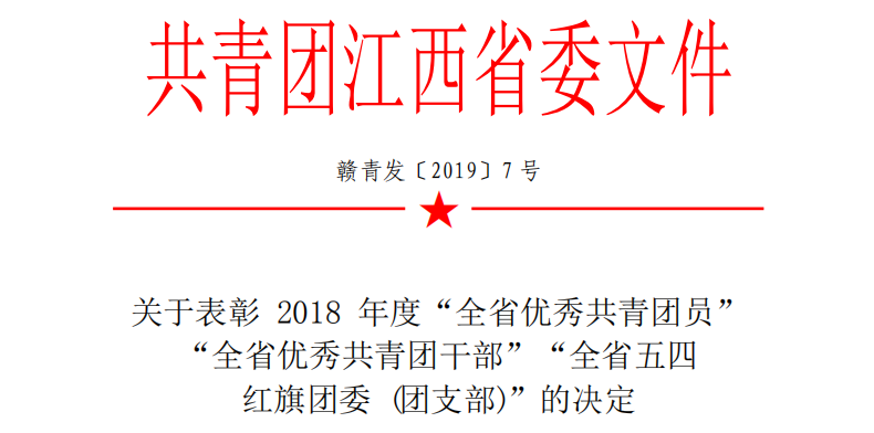 近日,共青团江西省委员会印发《关于表彰 2018 年度“全省优秀共青团员”“全省优秀共青团干部”“全省五四红旗团委 (团支部)”的决定》,beat365官网财税金融学院17级金融管理1班团支部荣获全省“五四红旗团支部”荣誉称号。
