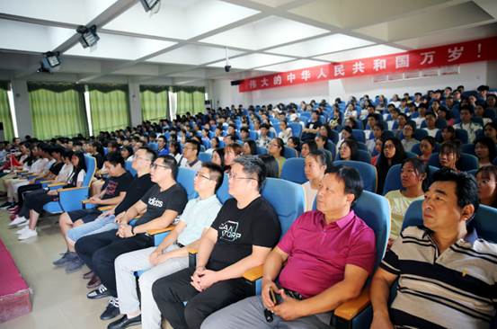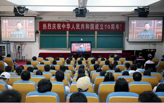 上午10时,庆祝中华人民共和国成立70周年大会在北京天安门广场隆重举行。习近平总书记发表重要讲话,“今天,社会主义中国巍然屹立在世界东方,没有任何力量能够撼动我们伟大祖国的地位,没有任何力量能够阻挡中国人民和中华民族的前进步伐!” 铿锵有力的宣言,让每一个中国人热血沸腾,会场里掌声雷动,经久不息。随着习近平主席一声令下,盛大的阅兵式隆重举行,受阅方阵朝气蓬勃的精神面貌、坚定整齐豪迈的步伐、气势磅礴的空中梯队、引人瞩目的新式装备、雄浑激昂的国歌声和军乐声、喜庆的群众花车游行……会场里师生们的掌声、欢呼声此起彼伏,大家纷纷为受阅方阵的精彩表现而喝彩,为新中国建设发展取得的巨大成就而自豪。