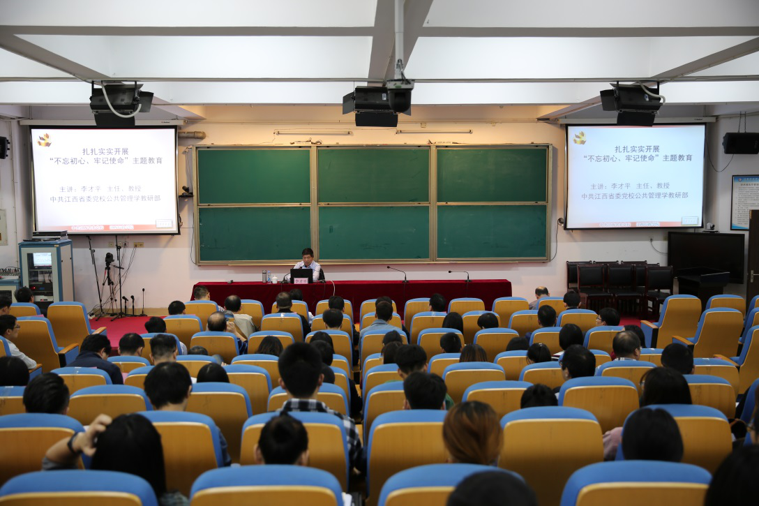 为扎实推进机关党总支“不忘初心、牢记使命”主题教育,11月4日下午,机关党总支在综合楼七楼新时代文明实践中心举办了“不忘初心、牢记使命”主题教育专题党课讲座。邀请江西省委党校公共管理教研部主任、江西行政学院应急管理教研中心主任李才平教授作了题为《扎扎实实开展“不忘初心牢记使命”主题教育》的专题党课讲座。机关党总支全体党员同志及部分二级学院学生党员代表近200人聆听了党课,讲座由机关党总支副书记黄亮主持。
