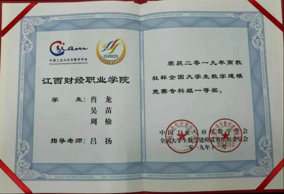 近日,2019年全国大学生数学建模竞赛获奖名单揭晓,beat365官网18软件(1)班肖龙、18软件(2)班吴苗、18审计(1)班周榆同学组成的参赛队在基础部吕扬老师指导下荣获全国一等奖。