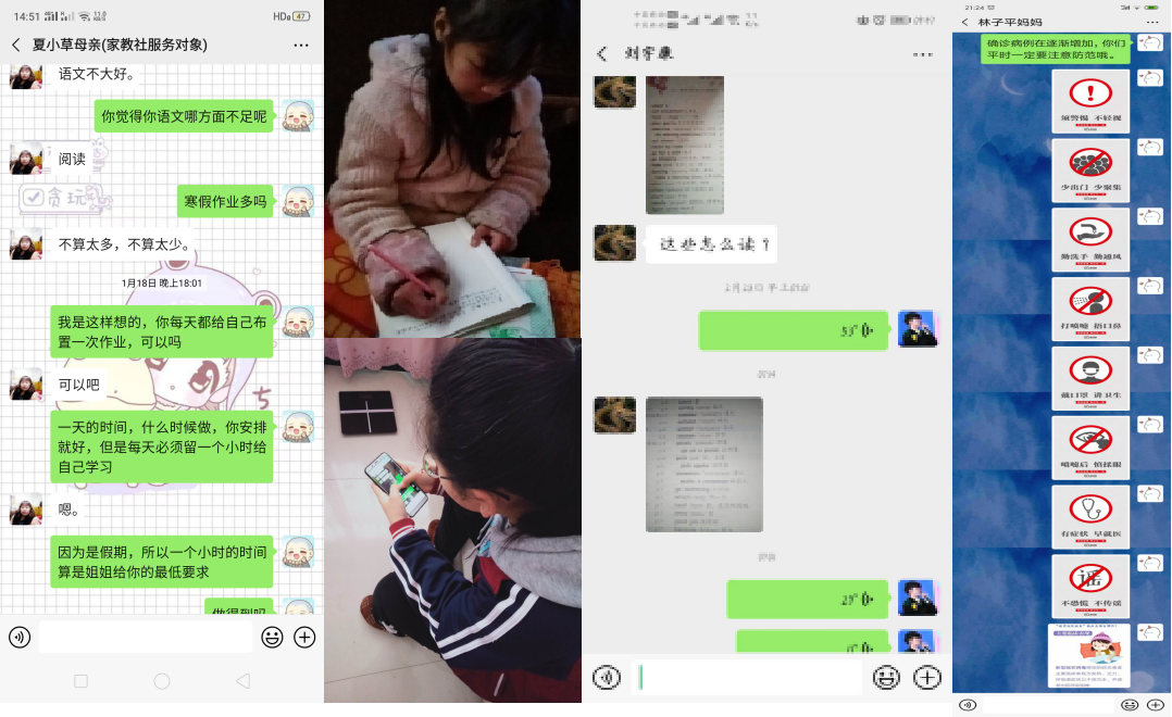 寒假期间前半段,队员们主要是辅导孩子们完成寒假作业,引导孩子阅读一些课外读物;后半段,由于新型冠状病毒肺炎爆发,考虑到孩子们喜欢聚集玩耍,有感染风险,便及时传授预防知识,让孩子们认识到病毒传播的途径和外出聚集玩耍的风险,引导孩子们尽量呆在家里多学些知识,同时,还积极与家长沟通,引导家长在家里与孩子多做些亲子游戏,增进亲情。