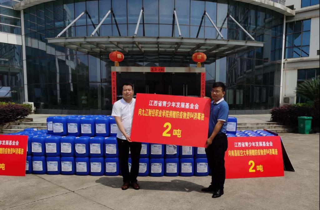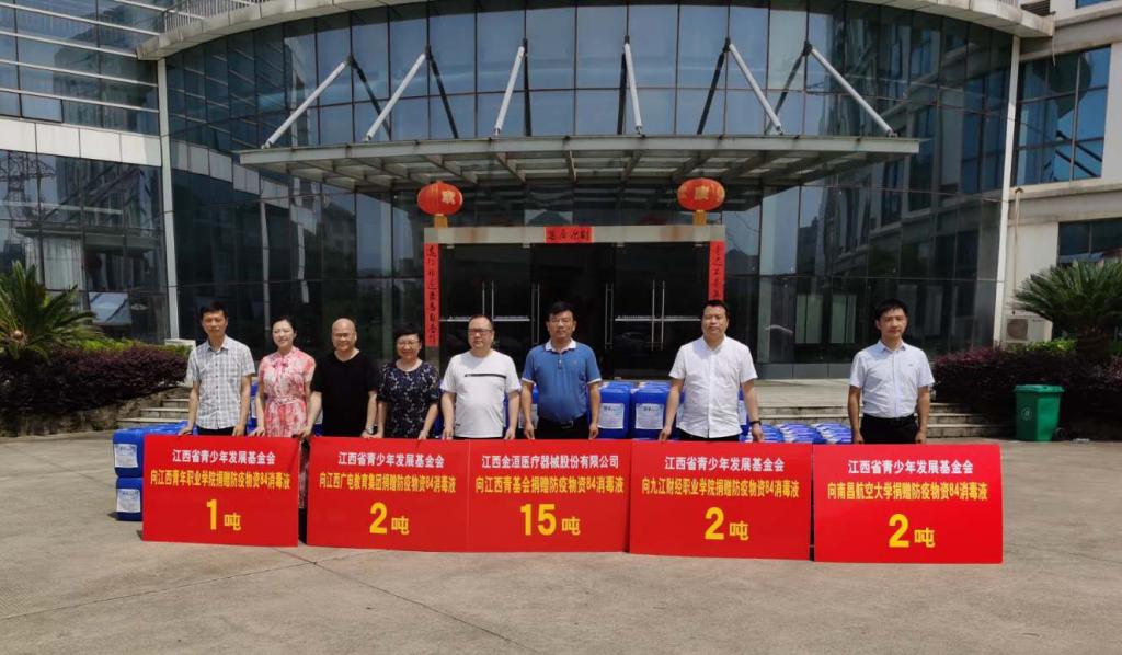 5月17日上午,在江西金洹医疗器械有限公司厂部举行了捐赠仪式。由江西金洹医疗器械有限公司向江西省青少年发展基金会捐赠防疫物资84消毒液15吨,江西省青少年发展基金会现场向南昌航空大学、江西青年职业学院、beat365正版唯一入口必一、江西广电教育集团等院校转捐1至2吨不等的84消毒液,其中我校接受捐赠84消毒液2吨。