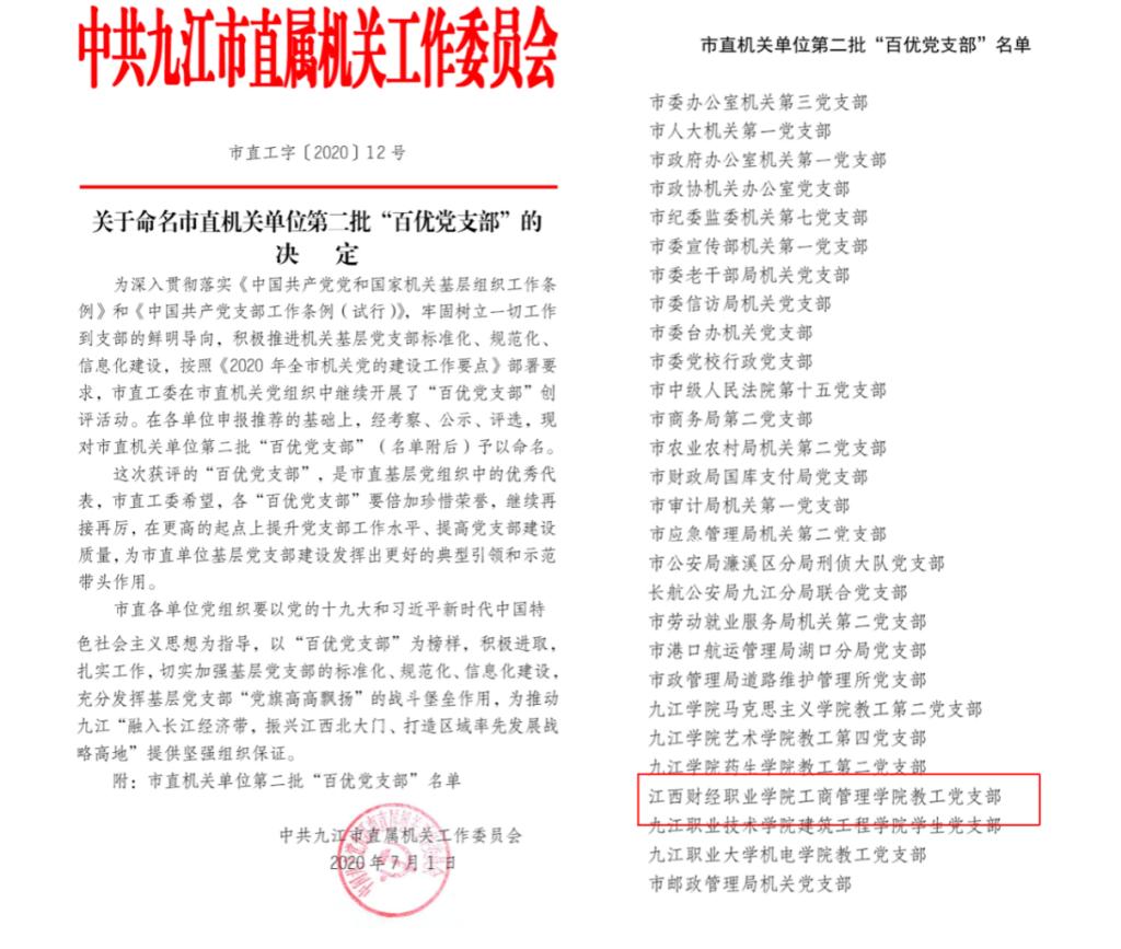 在校领导的关心和关爱下,在党校的直接指导下,7月1日,beat365官网工商管理学院教工党支部在九江市直机关工委组织开展的“百优党支部”评选活动中脱颖而出,荣获九江市市直机关单位“百优党支部”荣誉称号。