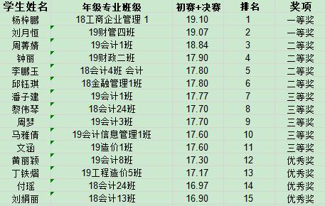 经过两个环节的角逐,公外组由来自18工商企业管理1班的杨梓鹏和19财务管理4班的刘月恒勇夺一等奖。涉外本科组的一等奖是由19商务英语1班的熊健同学获得。具体获奖名单如下。