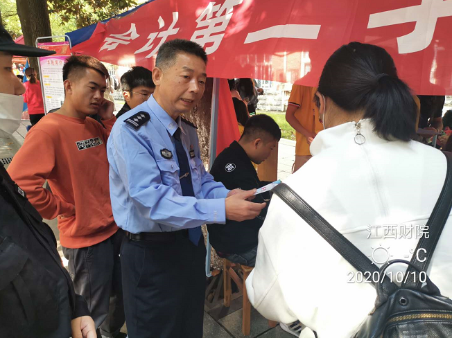 10月10日,学校新生报到日,民警万合兵通过现场散发防诈骗宣传单,讲解宣传栏的方式为新生宣传防诈骗、防盗等知识,当日共散发安全传单200余份。