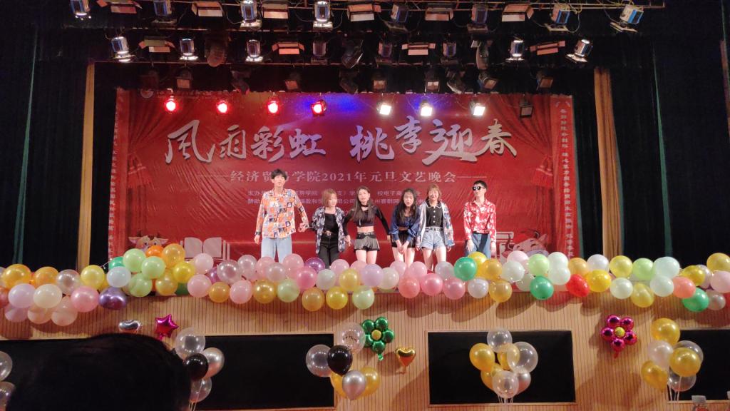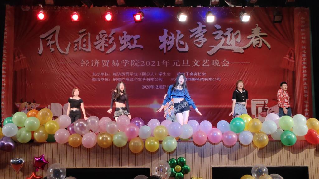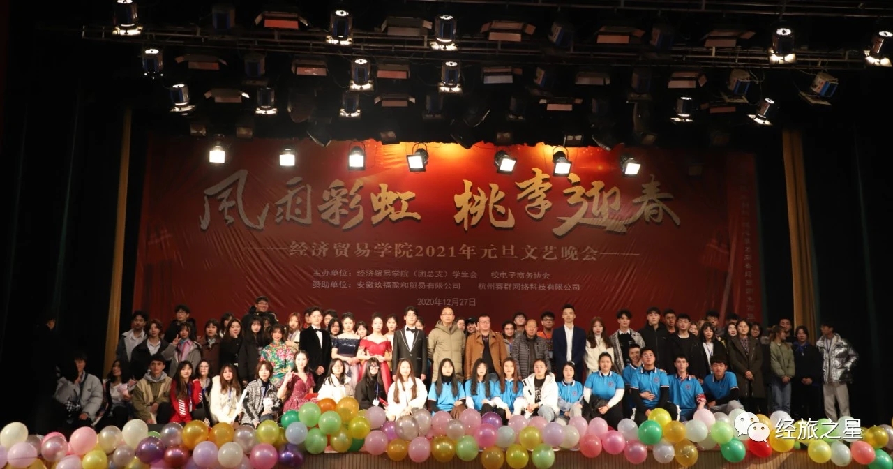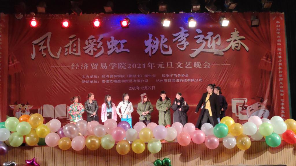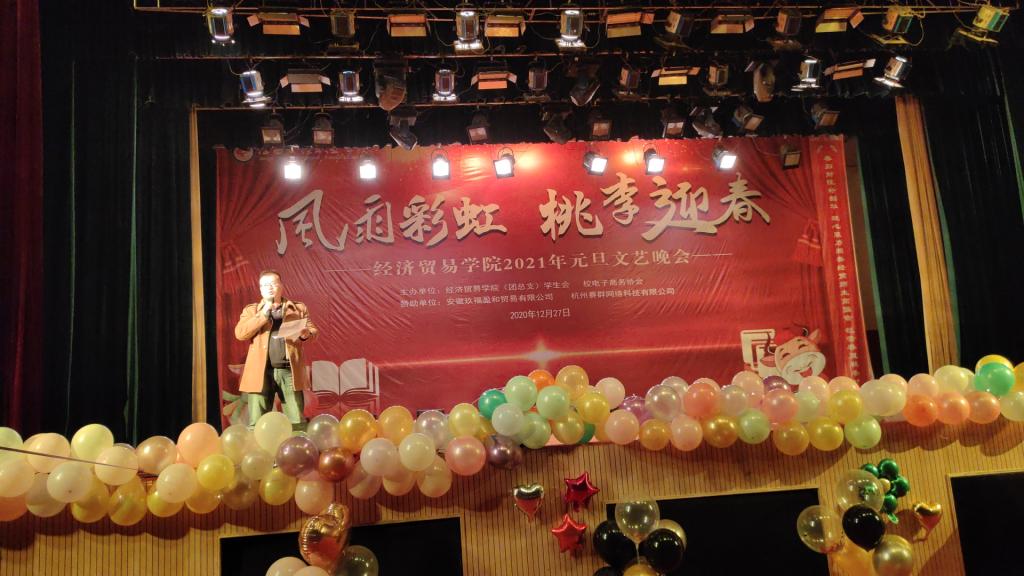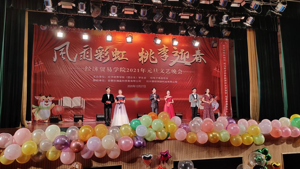 值此辞旧迎新之际,经济贸易(旅游管理)学院2021“风雨彩虹、桃李迎春”元旦文艺晚会暨优秀学生颁奖典礼于2020年12月27日晚19点在校英才交流中心隆重举行。经济贸易学院党政领导、杭州赛群网络有限公司院校负责人、以及beat365官网师生一千余人到场观看。晚会十佳大学生奖品由安徽玖福盈和贸易有限公司赞助支持。
