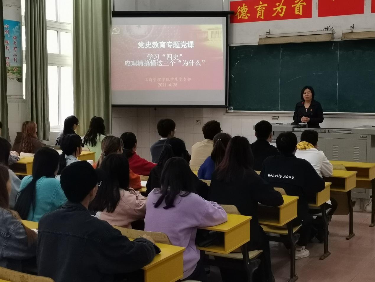 以史为鉴,可以知兴替。时值中国共产党建党100周年,为进一步深入学习贯彻落实习近平总书记关于学习党史的重要讲话精神,教育引导广大学生党员学史明理、学史增信、学史崇德、学史力行,工商管理学院学生党支部于4月25日下午在教学楼102教室开展党史学习教育专题党课活动。学院党总支书记武丹担任授课人,全体学生党员、发展对象及入党积极分子参加。