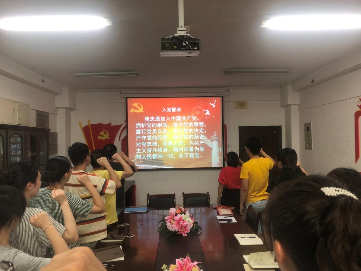 本次活动分为三个阶段。首先,武丹书记介绍了党员同志过“政治生日”的重要意义,党员同志们在武书记的领誓下,面向党旗重温了入党誓词。随后,武书记为任凤香、余莉莉、袁晨钊、王雨蒙、聂群华、陈其姝六名党员同志送上《党员政治生日卡》与政治生日寄语。六名党员分别作了表态性发言,感谢党组织的关怀,并表示在未来的工作中会时刻谨记自己共产党员的身份,将不忘入党初心,发挥先锋模范带头作用。