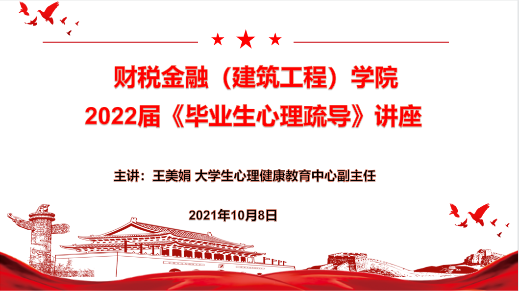 2021年10月8日,财税金融(建筑工程)学院在英才交流中心举办《高职毕业班学生心理疏导》讲座。讲座由校大学生心理健康教育中心副主任王美娟主讲,2022届毕业生900余人参加学习。