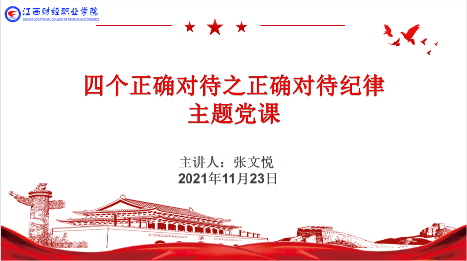 为贯彻落实学院《关于开展“四个正确对待”主题党课活动的通知》精神,扎实上好“四个正确对待”主题党课。2021年11月23日下午,数字经济学院教工党支部于红楼会议室开展“四个正确对待之正确对待纪律”主题党课,党课由数字经济学院党总支支委成员张文悦主讲,全体教工党员参加。