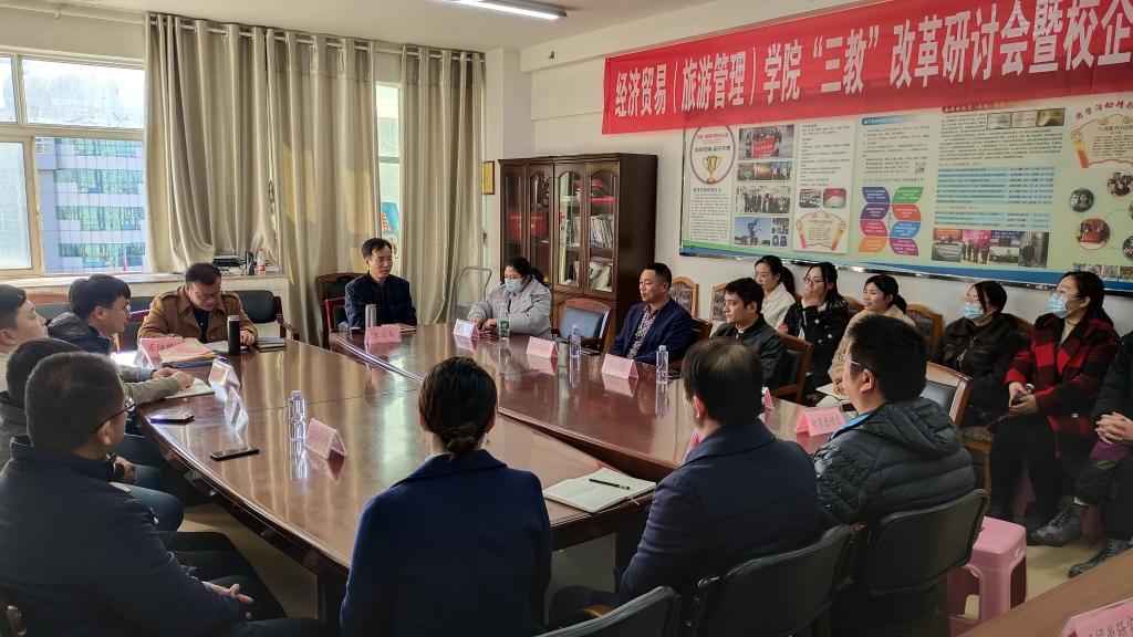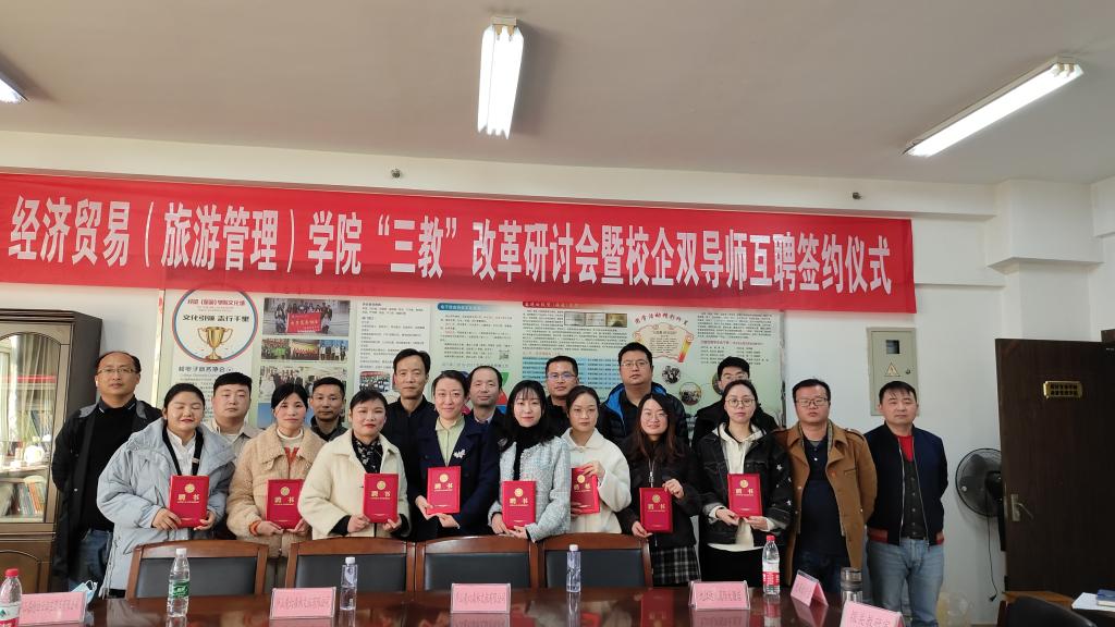 为深化教学改革,在教育部学徒制试点的基础上,拓展beat365官网其他专业现代学徒制试点及校企互聘双导师教学团队建设,经济贸易学院于11月23日,在综合楼804举行“三教改革”系列活动暨校企互兼互聘仪式,经济贸易学院党政领导及相关教师、合作企业代表、兄弟院校代表参加了此次仪式。