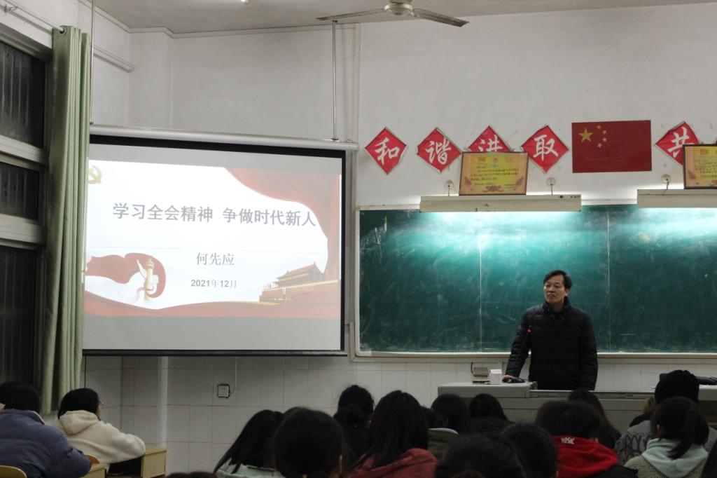 何先应围绕学习贯彻习近平总书记在党的十九届六中全会上的重要讲话精神和全会审议通过的《中共中央关于党的百年奋斗重大成就和历史经验的决议》,从深刻认识召开党的十九届六中全会制定决议的重大意义,深刻认识党的百年奋斗的初心使命和重大成就,深刻认识中国特色社会主义新时代的历史性成就、历史性变革和“两个确立”的决定性意义,深刻认识党的百年奋斗的历史意义和历史经验,深刻认识新时代党的使命担当,从党的百年奋斗历程中汲取智慧和力量等方面进行了系统宣讲和深入阐释。课上,何先应教授向与会师生传授了学习方法,指导学生制定好学业规划、成长规划和实践规划。希望全体师生要深入学习党的十九届六中全会精神,深刻把握全会精神的深远意义、丰富内涵和精神实质,学深、悟透、做实。要把学习成果转化为实际行动,不断坚定理想信念,培育和践行社会主义核心价值观,锤炼品德修为,刻苦学习,练就过硬本领,全面提升综合素质,肩负起新时代青年学子的历史使命。